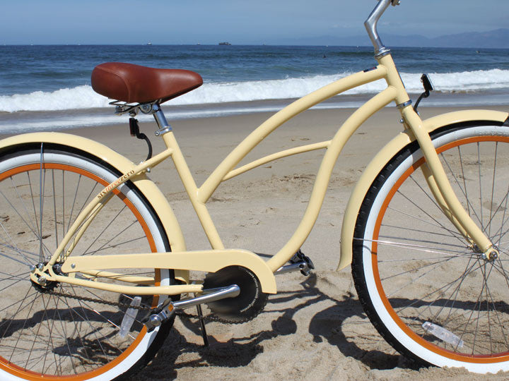 A creamy 17” frame is laid upon 26” whitewall wheels accent with just a splash of orange for a sophisticated, look that’s hard to not fall in love with. Matching brown bubble seat and cushion grips provide comfort as well as accented classic color. Cream front and rear fenders protect you from any puddles you encounter and maintain the classic look and feel while an optimal crankset configuration lets you pedal further easier than you thought it could be, even for a cruiser.